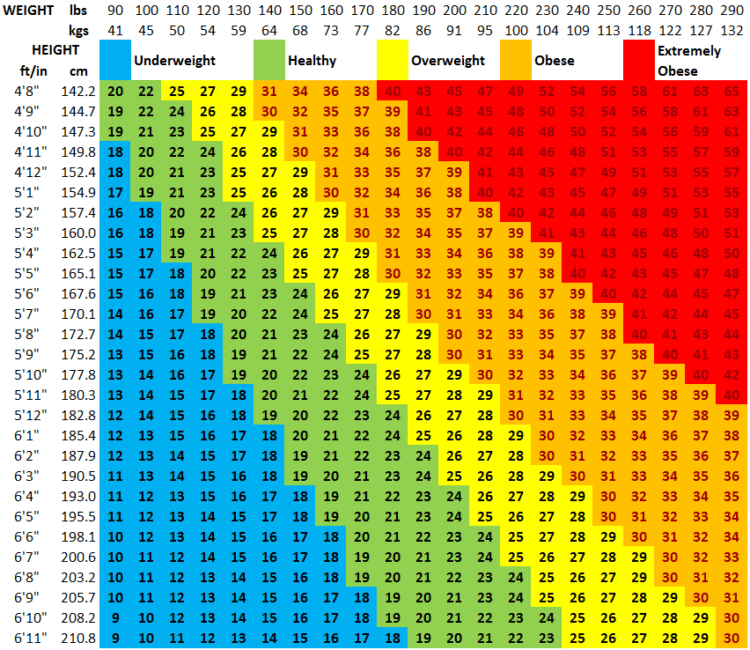 Another way to discover your BMI and ideal weight range is to use the National Institute of Health’s Body Mass Index Table:
